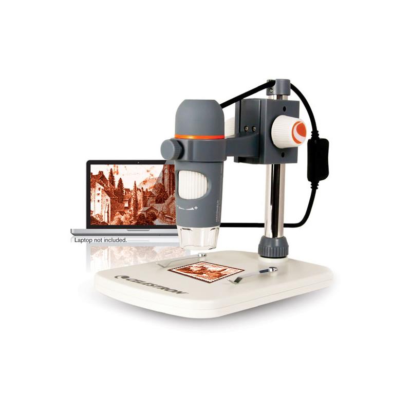 This USB-powered portable microscope can use the included Mac- and Windows-compatible Celestron Micro Capture Pro software to analyze, annotate, manipulate and save the transmitted images from the digital microscope. The included USB cable also allows real-time images to be displayed on a television or monitor screen or projected onto a wall screen.