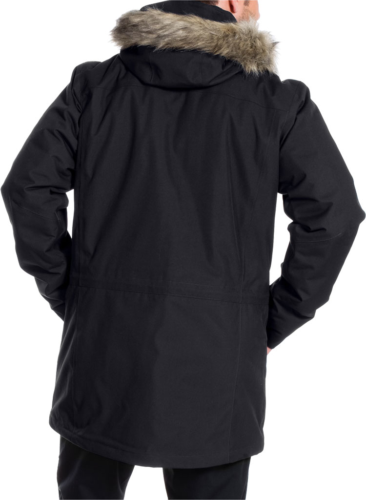 This waterproof parka is especially warm, durable and has ten pockets which provide plenty of storage space. The thick layer of synthetic insulation extends into the hood. The detachable faux fur trim on the hood, the integrated fleece cuffs and the slightly longer length all provide additional insulation.