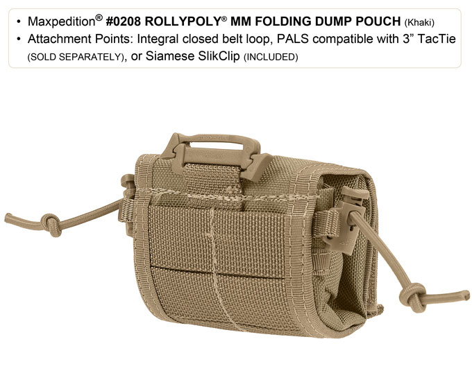 In its folded state, the Rollypoly can be attached to MOLLE or PALS webbing by means of a 3-inch TacTie (not included). Alternatively, a top loop allows the pouch to be piggy-backed using a Duraflex Siamese SlikClip (included).