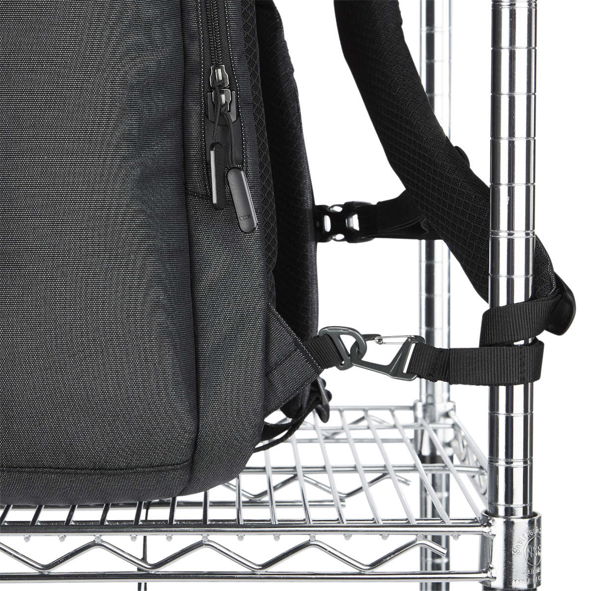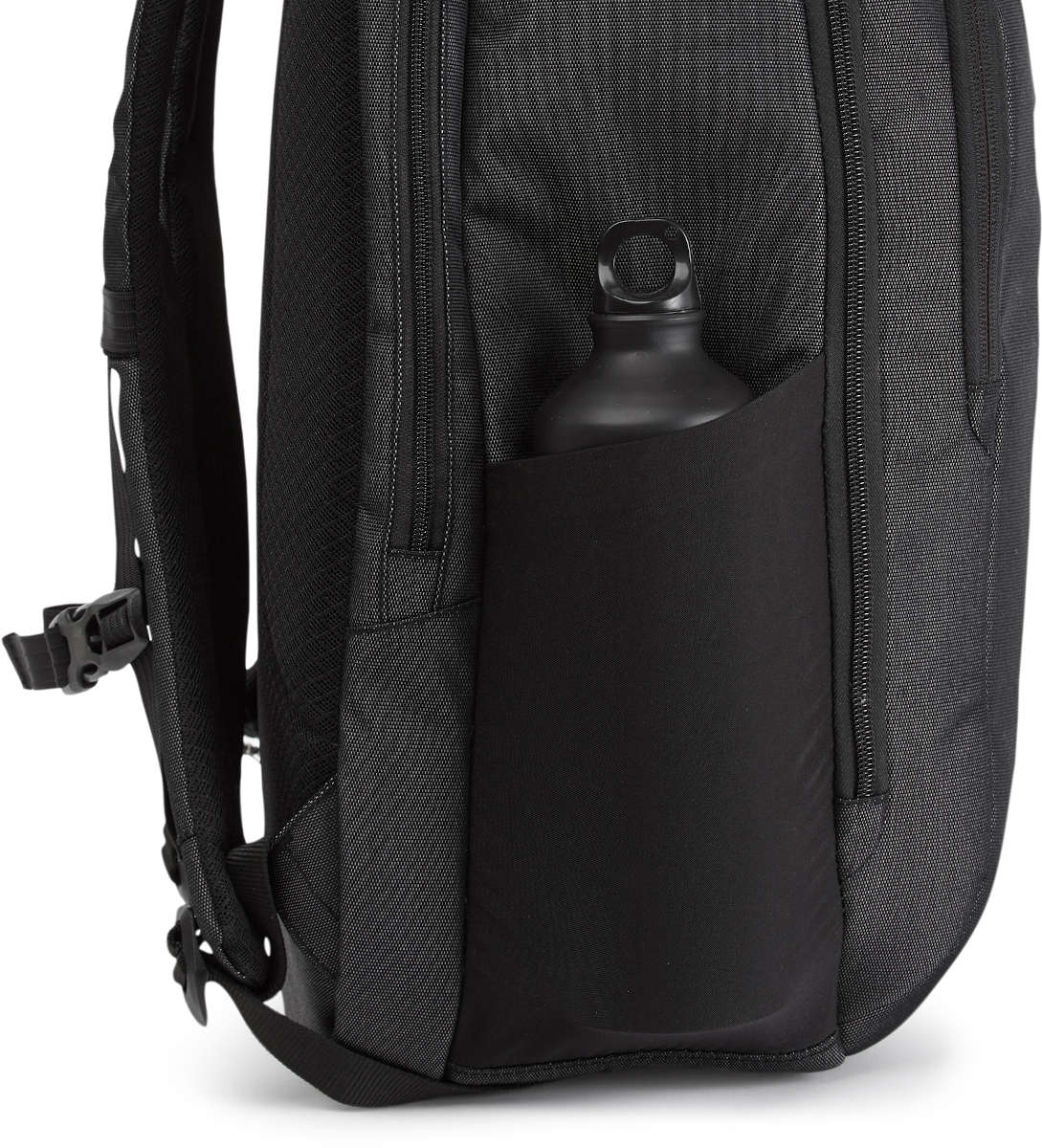 Spacious backpack with multiple security features. The polyester 900D construction incorporates an organisational compartment for travel essentials with rear padded tech pocket to accommodate a tablet (13”) and laptop (16”). The handle attach strap enables easy attachment to a wheelie handle. With anti-tamper zip, cut-resistant strap and safety pocket (RFID) plus café strap. Adjustable sternum strap and EVA padding to shoulder straps and back panel.