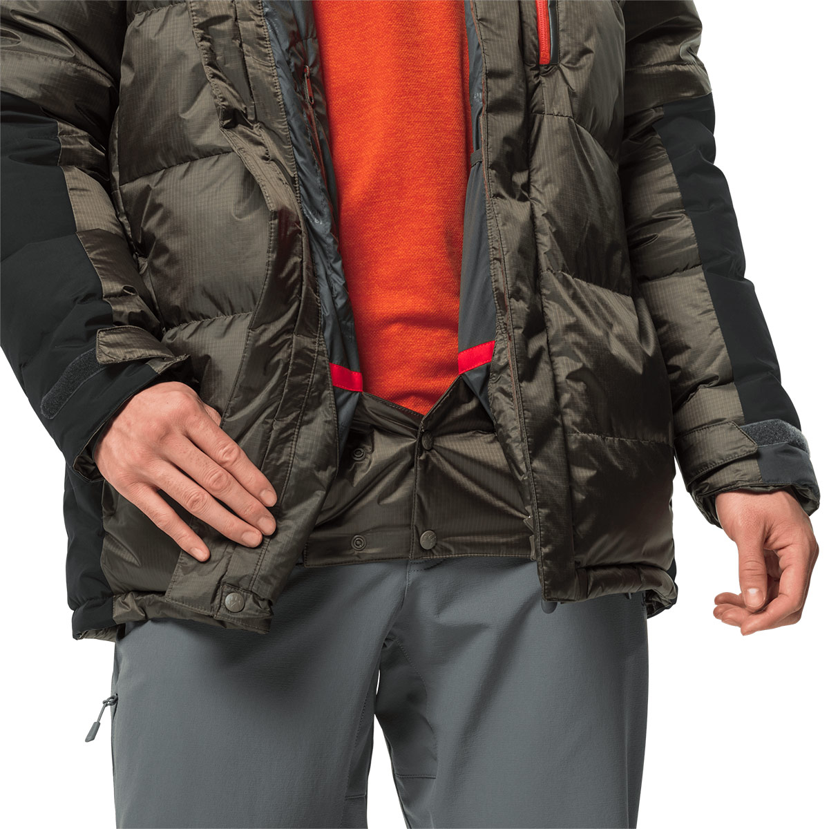 The STORMLOCK outer fabric blocks out the wind. It is also very breathable, so moisture vapour can escape quickly, which means the down is well ventilated and able to maintain its full thermal performance. The shoulders and arms are protected by robust, abrasion resistant STORMLOCK TASLAN. A lined snow skirt prevents snow or wind ingress from below.