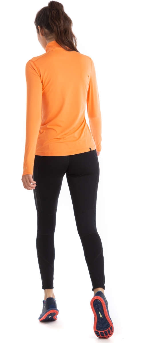 A lightweight, thermal base-layer designed to be worn next to the skin and ideal worn on cooler days or as a layering piece. This fabric is a super soft polyester with a really soft peached finish. Independent lab and wearer trials have provided very good wicking and evaporation results. The front zip allows flexibility for venting once you have warmed up on your run. This updated style has a cosy high collar, thumb loops and reflectivity.