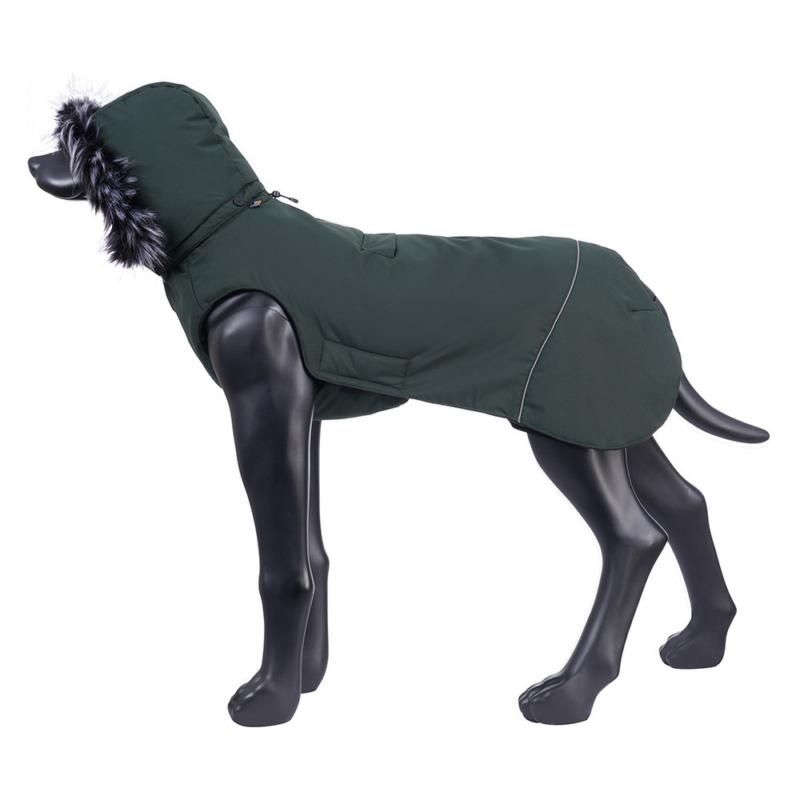 A warm, well-fitting padded coat for cold winter days. The sporty coat features a soft, warm lining and a moisture-resistant outer fabric. A detachable hood with fake fur to cover the dog's neck and ears.