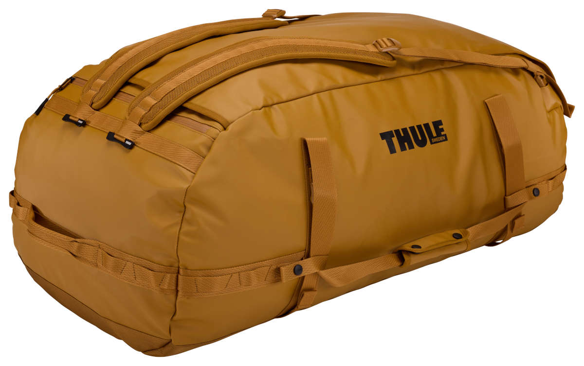 Thule Chasm 130L duffel bag is a rugged, weather-resistant bag that can be converted into a backpack with shoulder straps that tuck away after use.