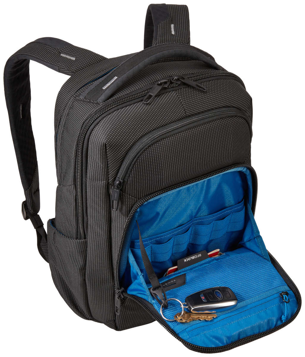 The backpack's crush-resistant SafeZone pocket is perfect for fragile items while the PowerPocket organises your cables and makes it easier to charge your electronics on the go. Protect your personal information from theft with the RFID-blocking pocket and store your 14" laptop and 10.1" tablet in the two thickly padded compartments. Thule Crossover 2 laptop backpack is designed with weather-resistant, lightweight materials – all with a sleek and professional finish.