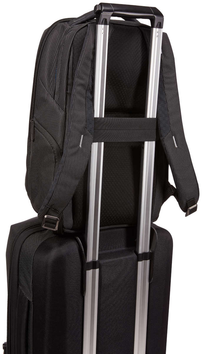 - Securely attach backpack to rolling luggage with the pass-through panel